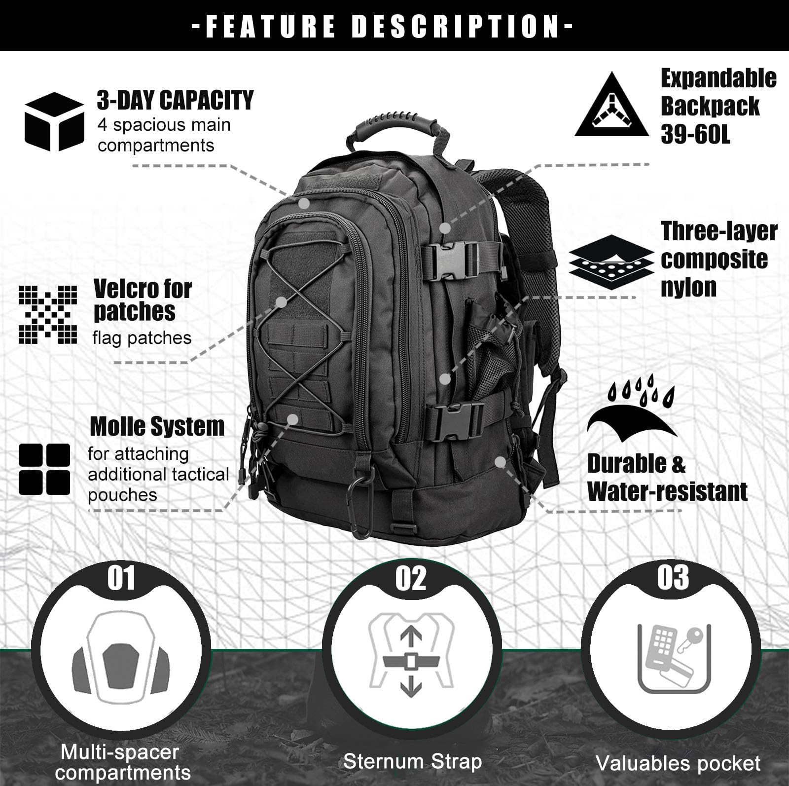 Большой армейский рюкзак “тревожный” (Bug Out Bag) на 3 дня, расширяемый походный рюкзак, армейский дневной рюкзак для активного отдыха, пешего туризма и охоты .