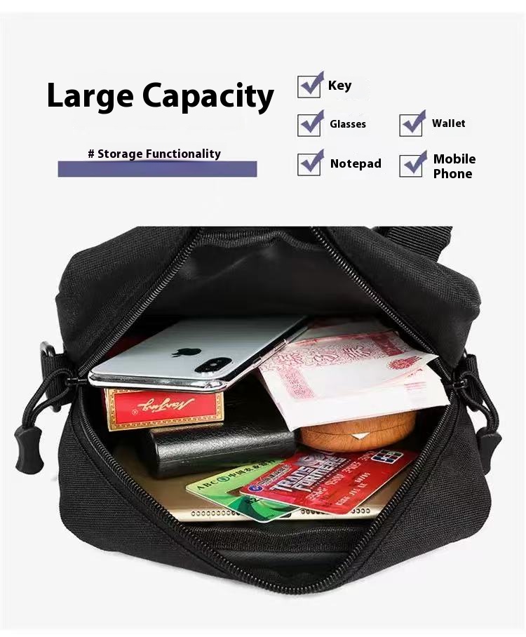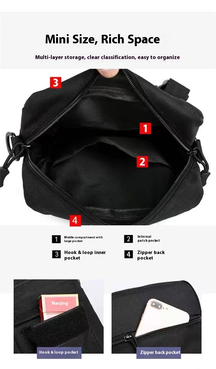 Размеры: 19,8 см (Д) x 24,9 см (В) x 6,9 см (Ш). Функциональные отделения разного размера достаточны для удовлетворения ваших основных потребностей на открытом воздухе. Основное отделение на молнии может вместить iPad 4, бутылки с водой и другое; 1 дополнительный карман спереди для мелочей, таких как документы, ключи от машины; 1 карман на молнии сзади для мобильного телефона, кошелька и других ценных вещей, защита от кражи; 1 карабин спереди.